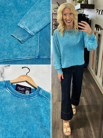 Riley Ribbed Accent Pullover - Mineral Washed Teal