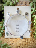 Stretch bracelet featuring 8 hanging charms and a cross along the band!