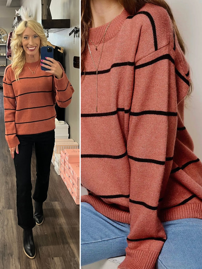 • Autumn Cozy Striped Crewneck Sweater - Red Fox