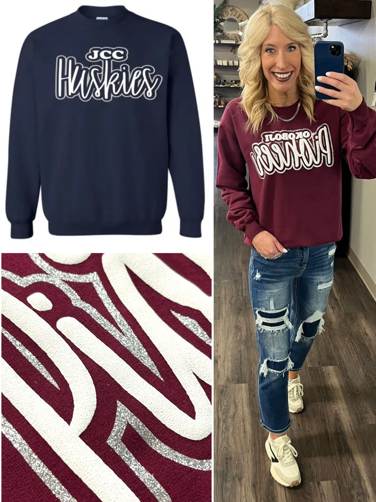 The crewneck sweatshirts will be bold navy, featuring white puff lettering, surrounded by a sparkling silver glitter outline. Crewnecks are available in size Small, Medium, Large, XLarge and 2XL. (Please send a message if needing 3X or Kids sizing!!) These are a PRE-ORDER item. These are Gildan Brand. (50% Cotton, 50% Polyester) Please leave your email or phone number when placing the order for notification when the crewneck is ready! These can be picked-up or shipped! Thank you!!!