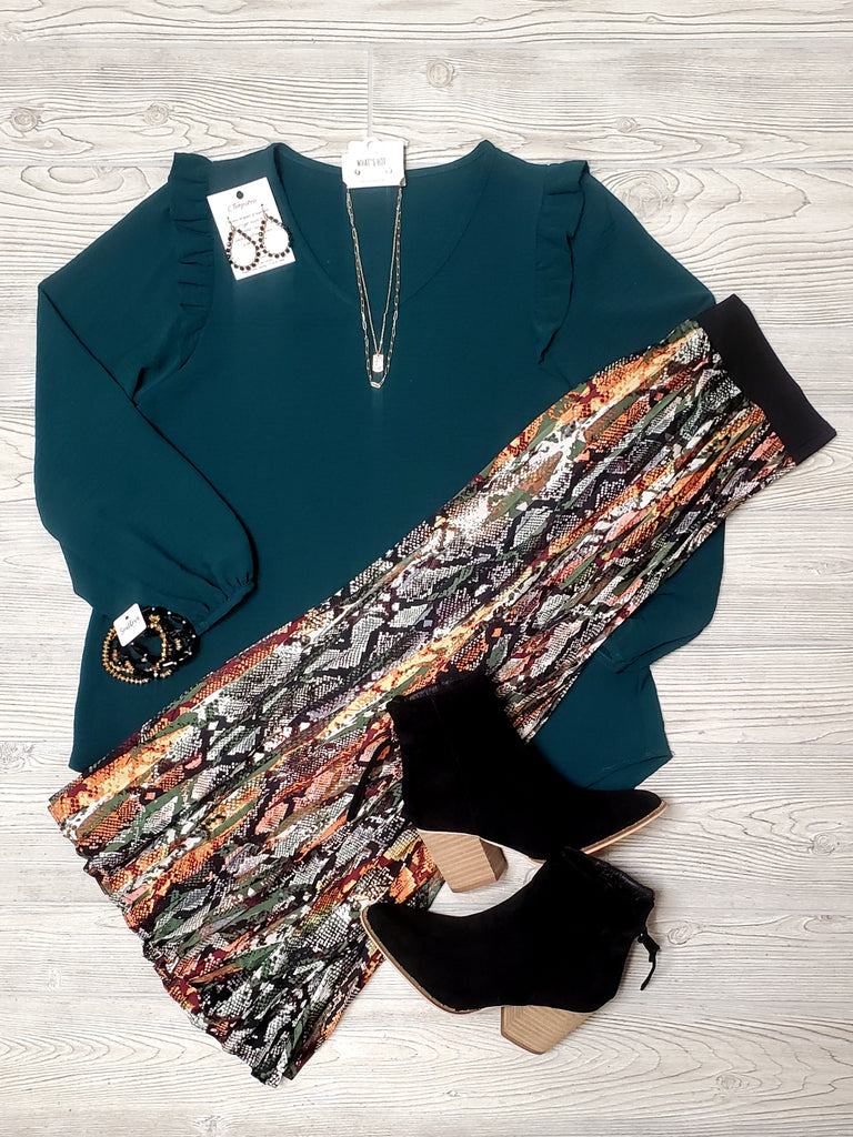 • Leslie Pleated Snakeskin Midi Skirt